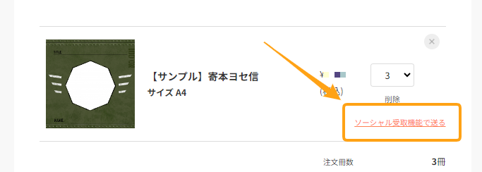 カートの購入ページ内のそれぞれのブックの右下あたりにある「ソーシャル受取で送る」をクリックすると、ソーシャル受取注文用ページに移行します。