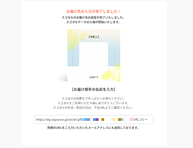 決済が完了すると、受取人様配送先入力用ページのURLが発行されます。受取人様にURLを共有してください。