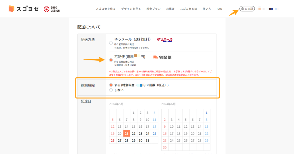 ③「スゴヨセを製本してお届けする」ページの「配送について」項目内「配送方法」で「宅配便 」を選択。