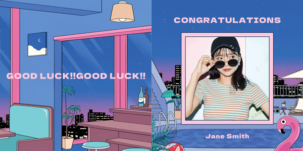 夜の帳(とばり)が降りた街のきらめき、ノスタルジックなプライベート空間、そして非日常へと誘うナイトプールの情景を、鮮やかな色彩とレトロポップな雰囲気で表現しています。