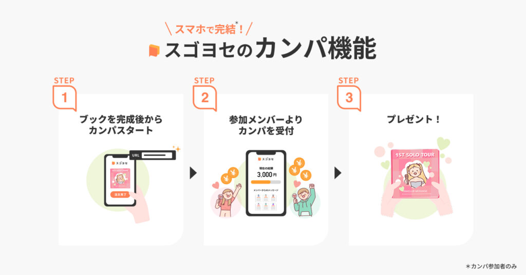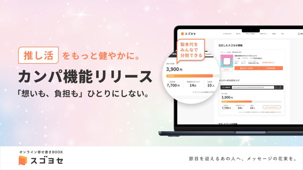 スゴヨセに、制作費を参加メンバーで出し合える新機能「カンパ機能」が追加されました。寄せ書き企画では、主催者一人が費用を負担してしまうケースも少なくありません。
